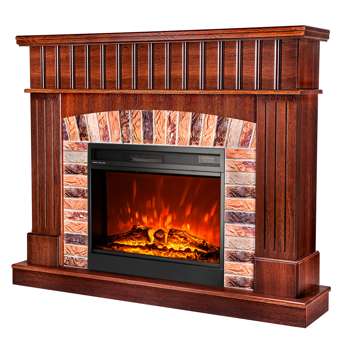 Electric fireplace "Mirabela" is made in a standard form with a hearth and 3D fires. The functionality of the device consists of 2 modes: decorative mode and heating mode. In decorative mode, the electric fireplace creates the effect of a burning fire, the brightness of which can be adjusted using the remote control that comes with the kit. In heating mode, the device is capable of heating a room of 20 m2. Overheating protection is responsible for the safety of the fireplace.